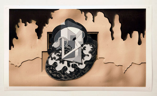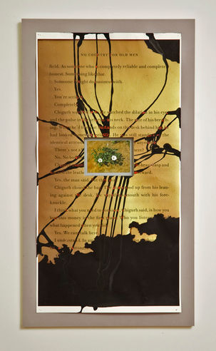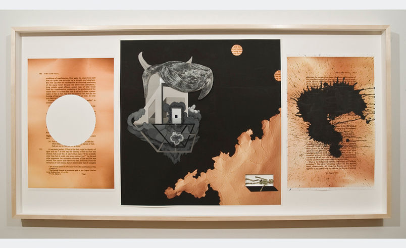 Relief painting made of stacked paper, acrylic, ink, found object, and gicleé print